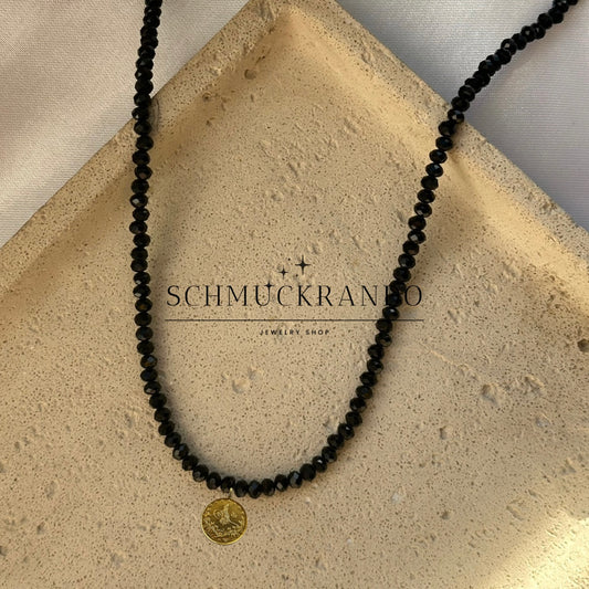 Schwarze Kristalperlen-Kette mit Resat Münze 22k Lira, Reshadiye