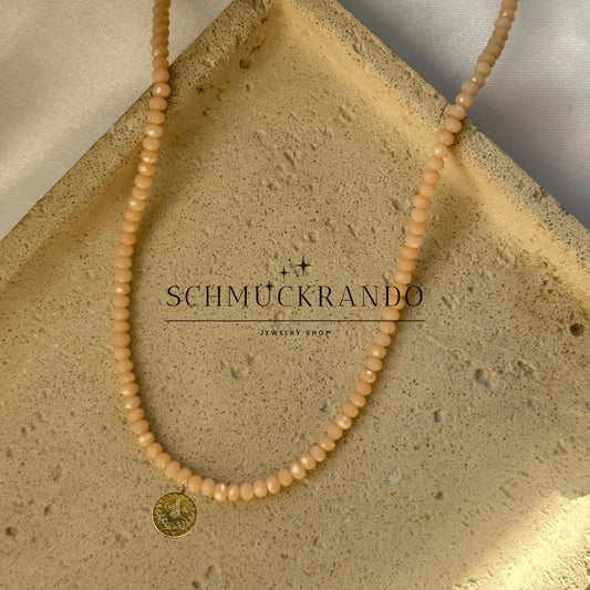 Beige Kristalperlen-Kette mit Goldmünze Cumhuriyet Altin Münze 22k Lira, Piaster