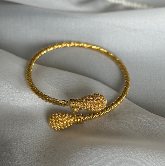 Der Armreif besticht durch seine fein gedrehte Struktur und die detailreich gearbeiteten Endstücke, die mit kunstvoll gesetzten Goldakzenten veredelt sind. Sein edler Glanz und das harmonische Design machen ihn zu einem Must-have für Liebhaber:innen exklusiver Schmuckstücke.