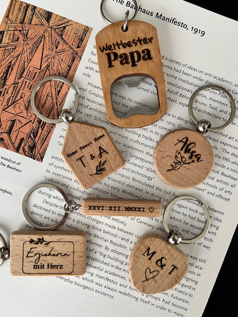 Entdecke unsere personalisierten Holz-Schlüsselanhänger mit Lasergravur – stilvoll, natürlich und individuell.